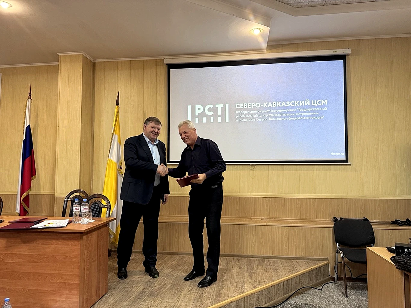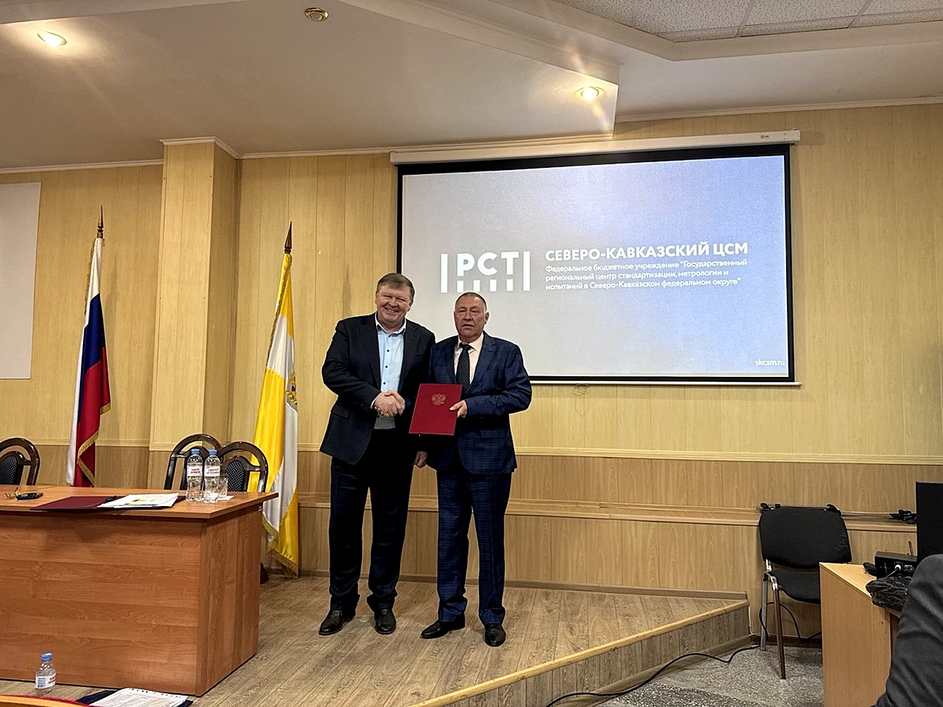 В завершение обсуждения рабочих вопросов генеральный директор ФБУ «Северо-Кавказский ЦСМ» Виталий Коршак вручил почетные грамоты сотрудникам, чей стаж работы в центре достиг 25 лет – начальнику отдела поверки и калибровки механических и геометрических средств измерений Пятигорского филиала Игорю Каплунову и ведущему инженеру по метрологии Невинномысского филиала Людмиле Заболотней (грамота передана директору Невинномысского филиала).