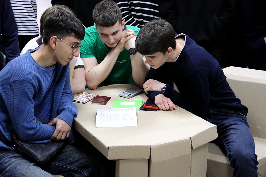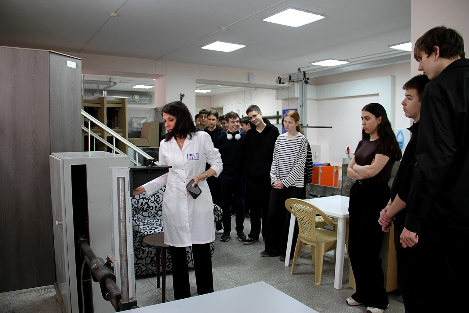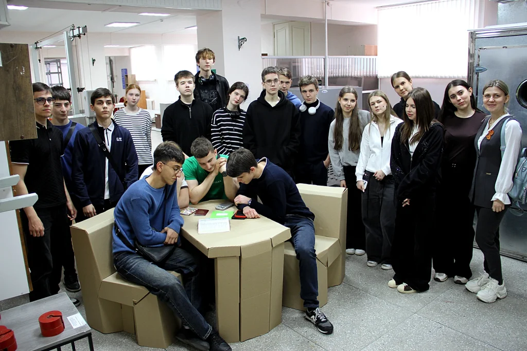 Большое впечатление на учащихся произвела лаборатория по испытанию мебели, а точнее, картонные столы, стулья, диваны, созданные для коворкингов и уже прошедшие испытания. Заведующий лабораторией Ольга Безменова показала, как проводят испытания матрасов, крышек столов, ящичков для детского сада и выдвижных элементов корпусной мебели.