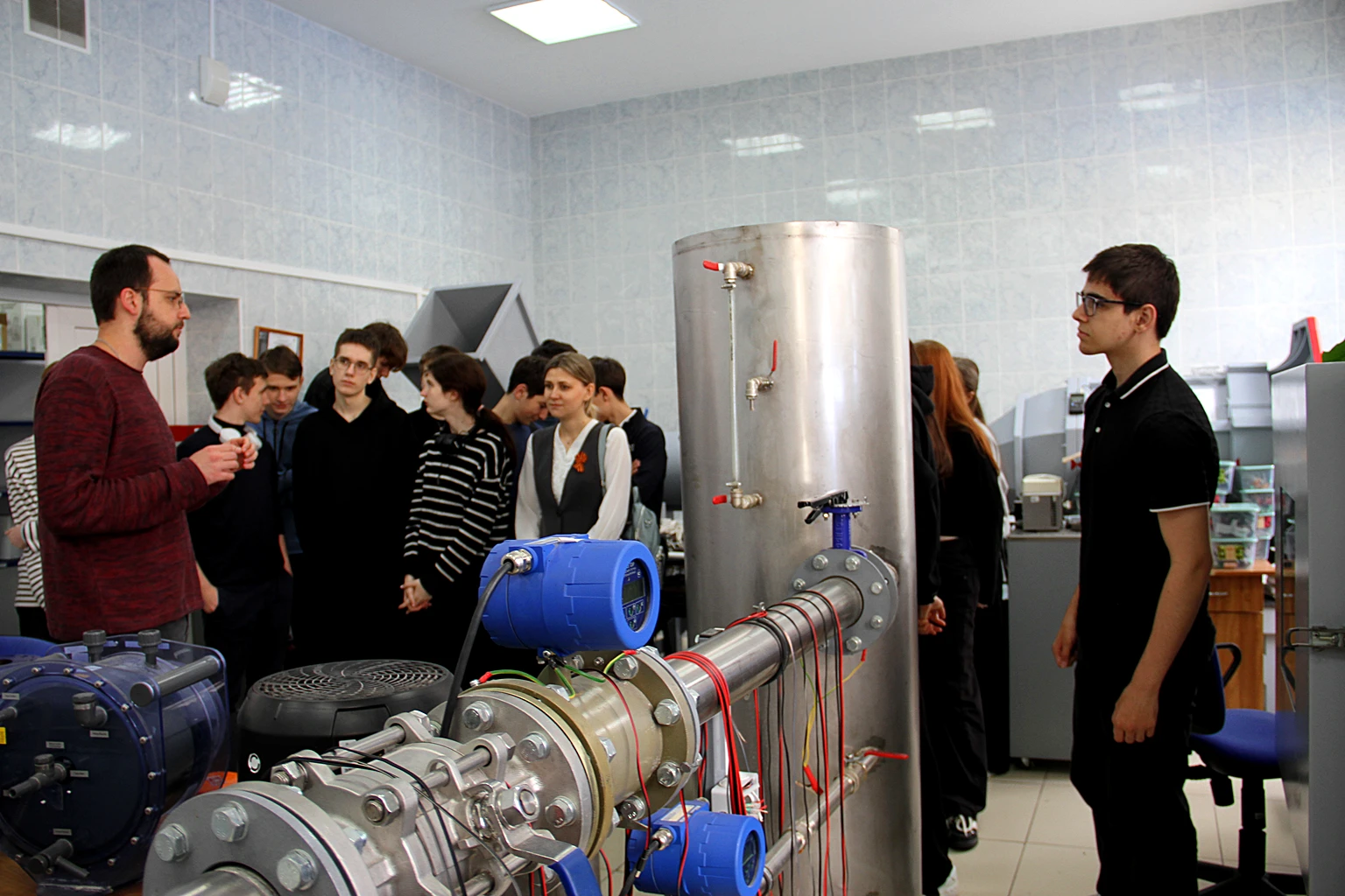 В одной из лабораторий школьникам показали гири, весы и компараторы массы, рассказали о значении поверки и методах ее проведения. В лаборатории расхода жидкости продемонстрировали проливную и аэродинамическую установки, счетчики и расходомеры, которые доставили сюда на поверку.